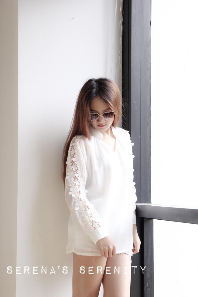 เชิ้ตชีฟองสีขาว แขนเสื้อแต่งด้วยผ้าลูกไม้ล