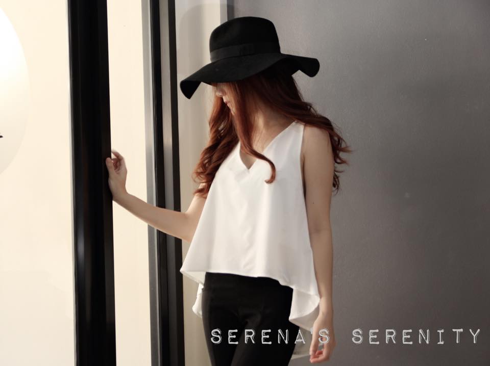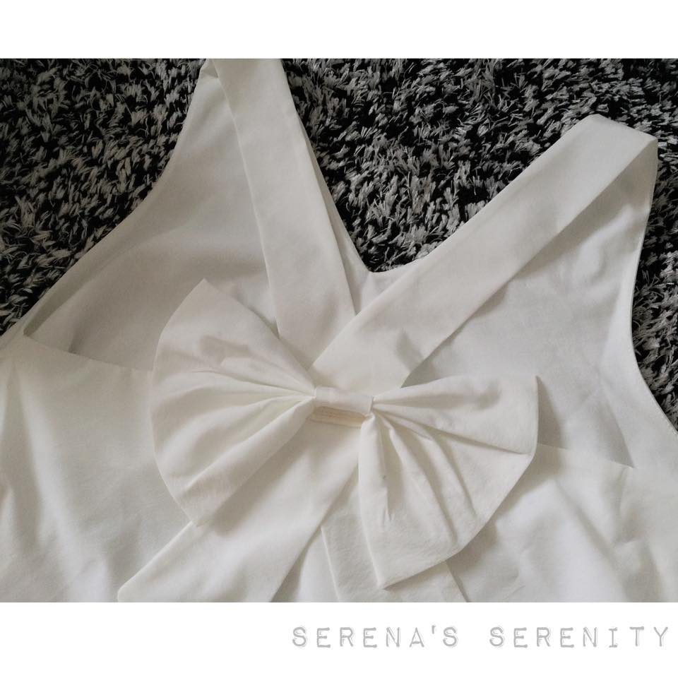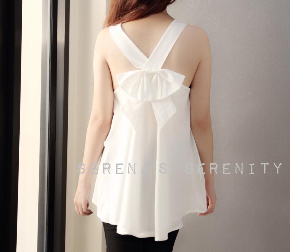 เสื้อแขนกุด คอวี ชายเสื้อหน้าสั้น หลังยาว ด้านหลังแต่งโบว์ เนื้อผ้าเป็นผ้าไหมอิตาลี ทรงปล่อยๆ ใส่สบาย แมทกับยีนส์ สกินนี่ หรือกระโปรงทรงดินสอก็ดูชิค